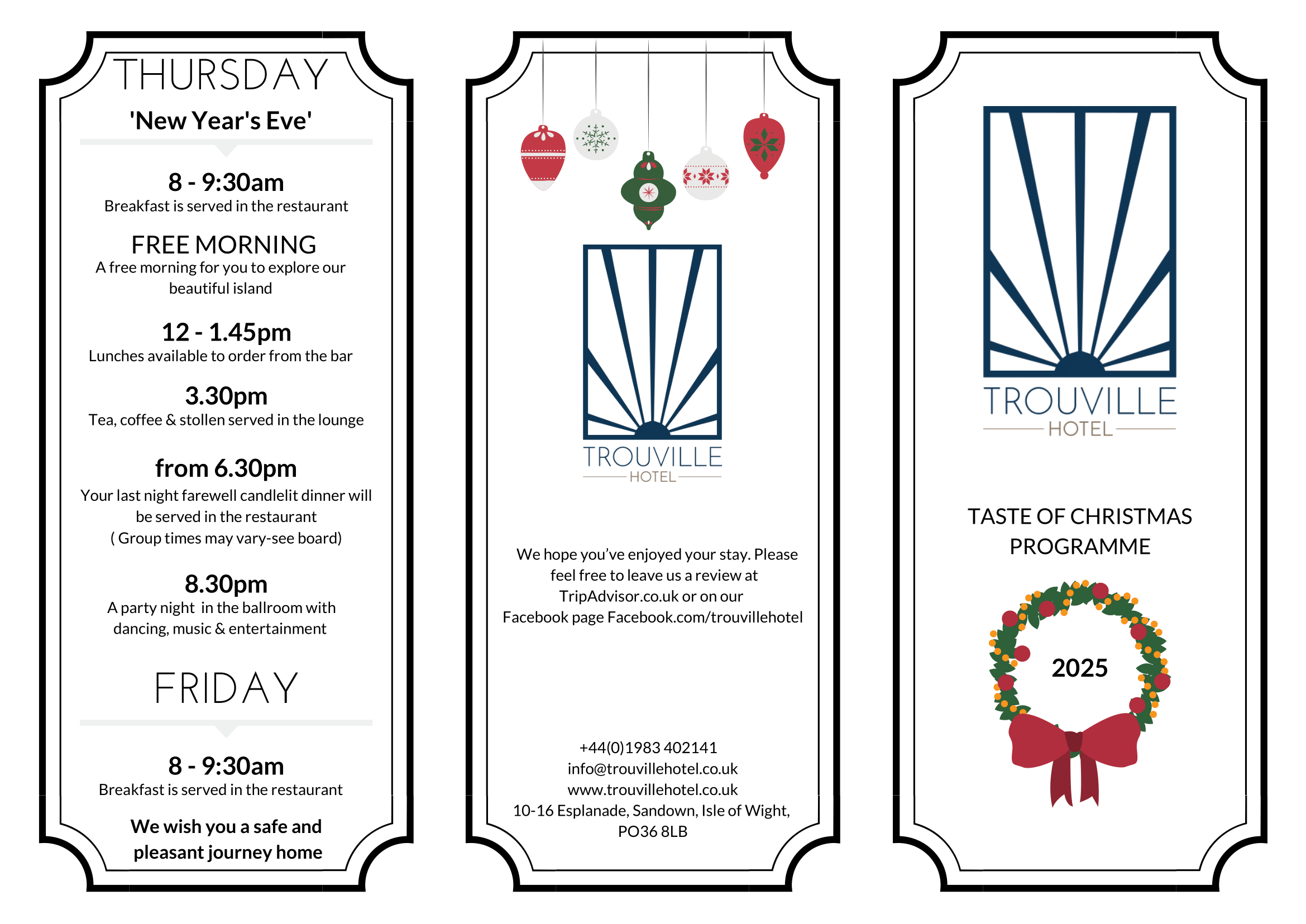 Situated centrally on Sandown’s seafront, opposite the golden beach, and with panoramic views over the sweep of Sandown & Shanklin Bay is the Trouville Hotel. All the well-appointed, en-suite bedrooms have TV, telephone, hairdryer, and tea/coffee making facilities. The hotel offers a lift, restaurant, bar, ballroom, function room and some live entertainment during your stay.
